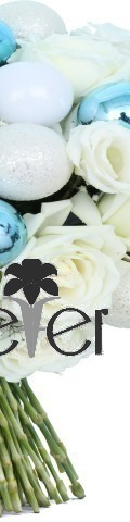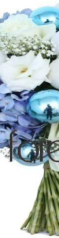 The Blue Christmas Flower Bouquet gives classic Christmas flowers a contemporary twist. The stylish choice for corporate events, end-of-year functions, new baby arrivals, and festive celebrations, this stunning flower arrangement includes 1 blue hydrangea, 4 white roses, 2 white lisianthus, gypsophila sprays, and for added festive cheer, 8 beautiful blue baubles and 5 white baubles. A bauble-icious bouquet for Christmas, it is fabulously frosty and designed to delight the recipient.